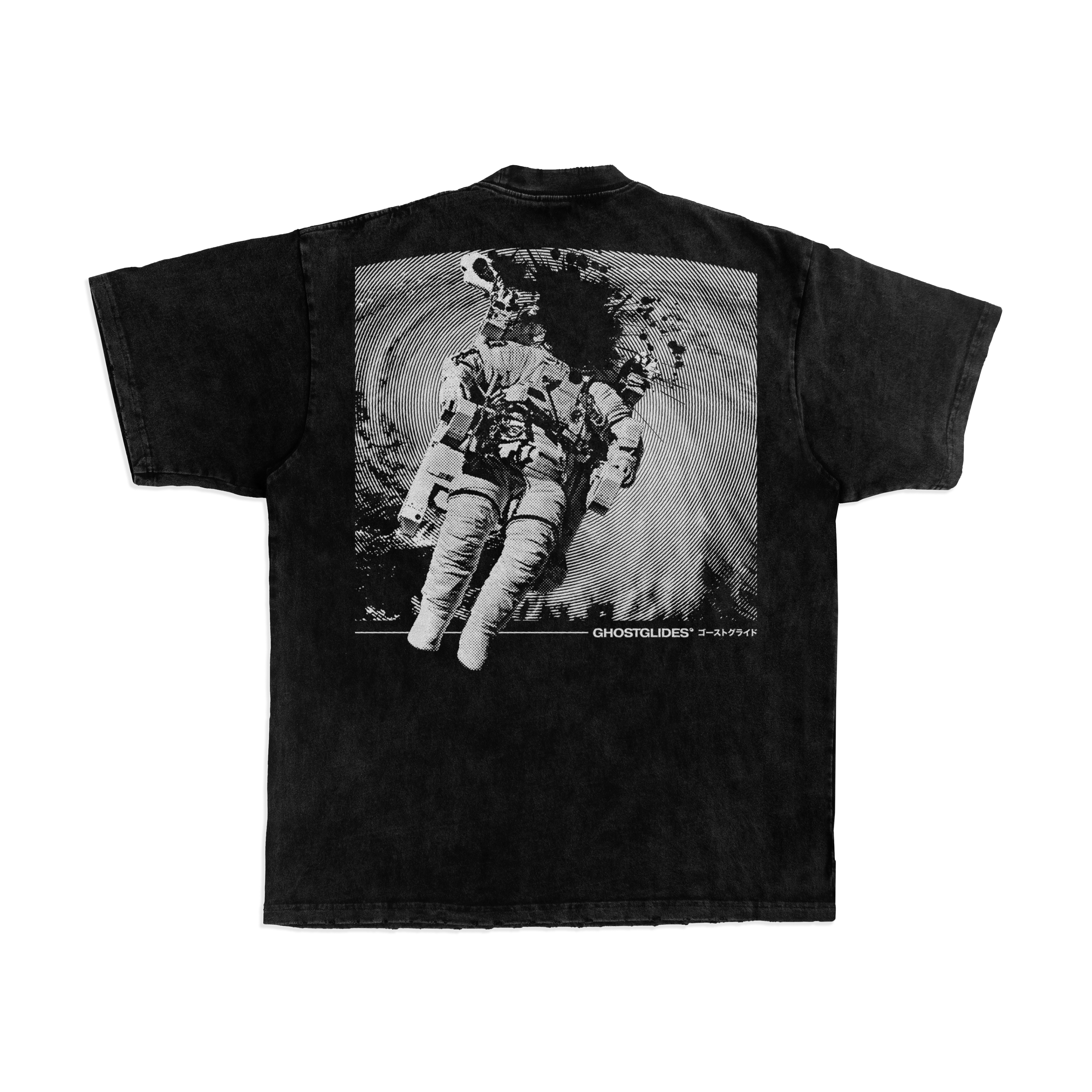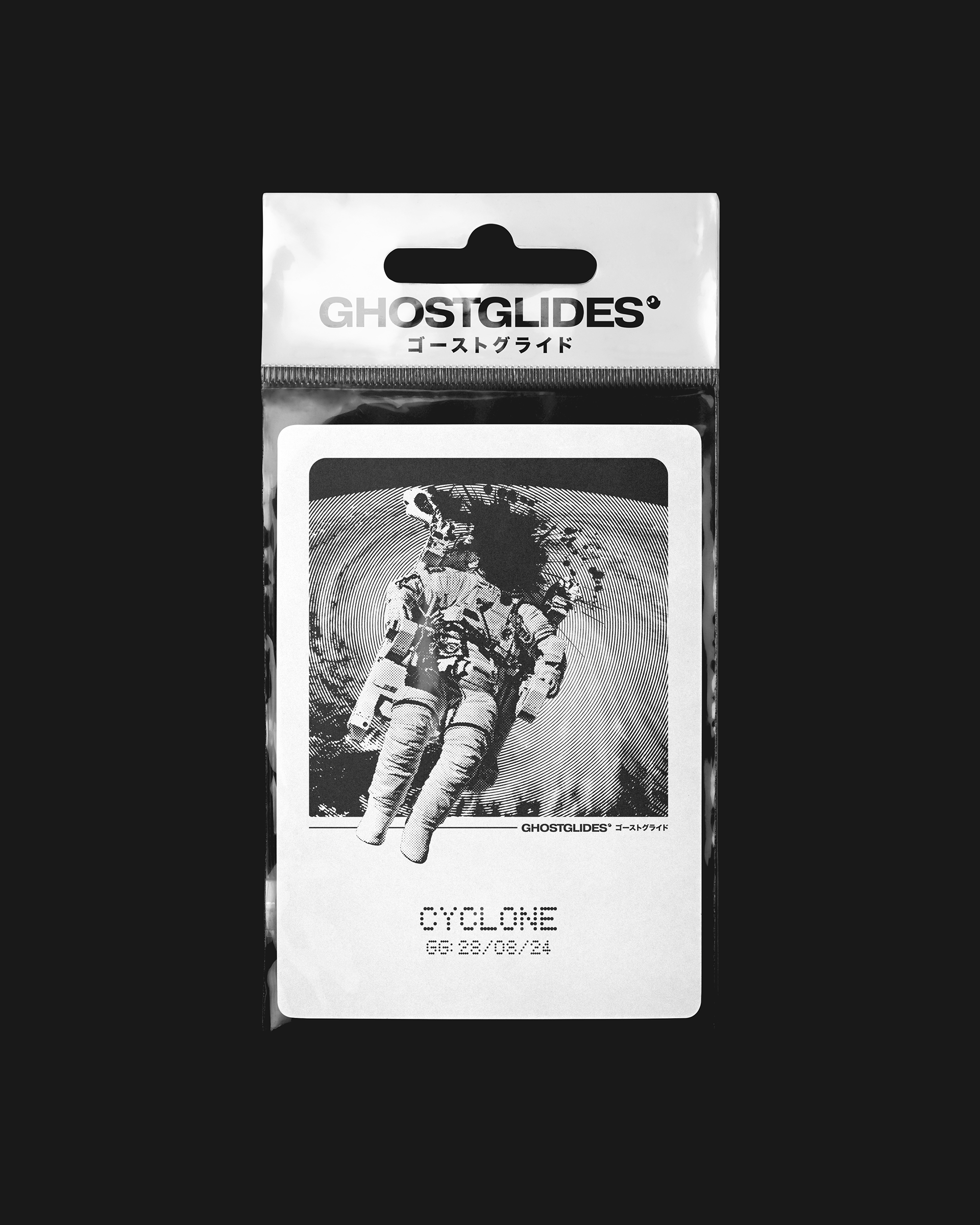 This is a commemorative merchandise design for a best-selling product, "Cyclone" mouse skates. The idea was to use a graphic in minimal colors. The images are from the public domain and were released by NASA. The color palette is black and white to maintain a retro feel.