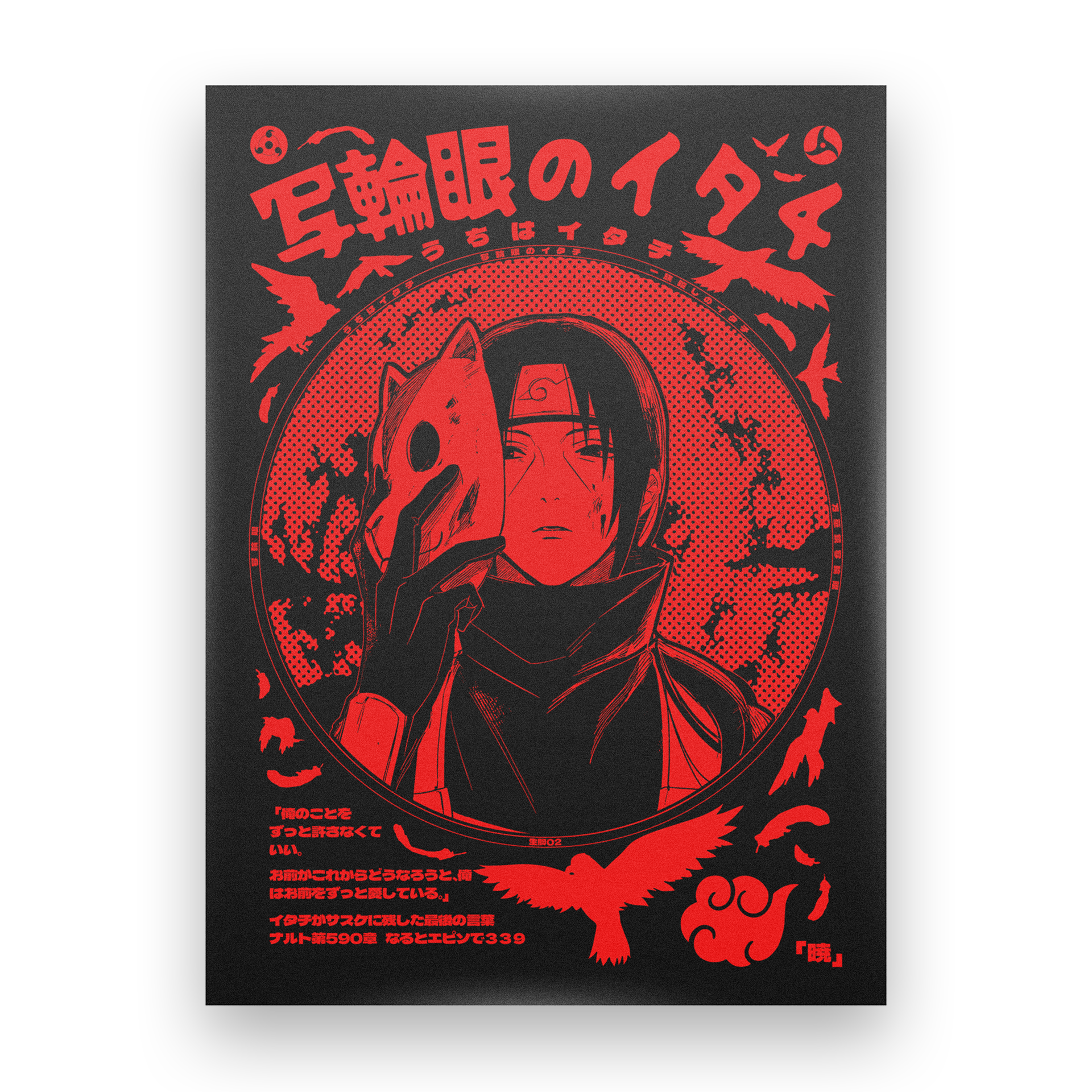 This single color design is based on the very famous character "uchiha itachi" from the very famous anime "naruto." It uses crow silhouettes, feathers, the uchiha seal, sharingans, and akatsuki symbols, with the main background being the moon.