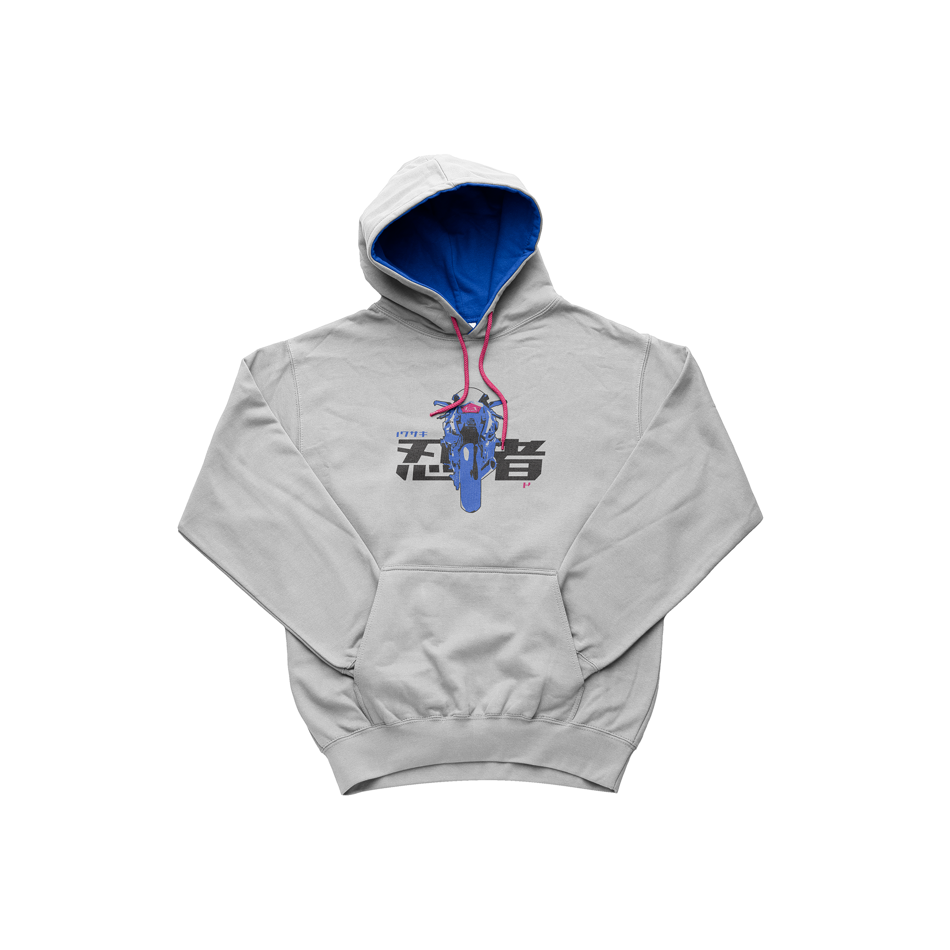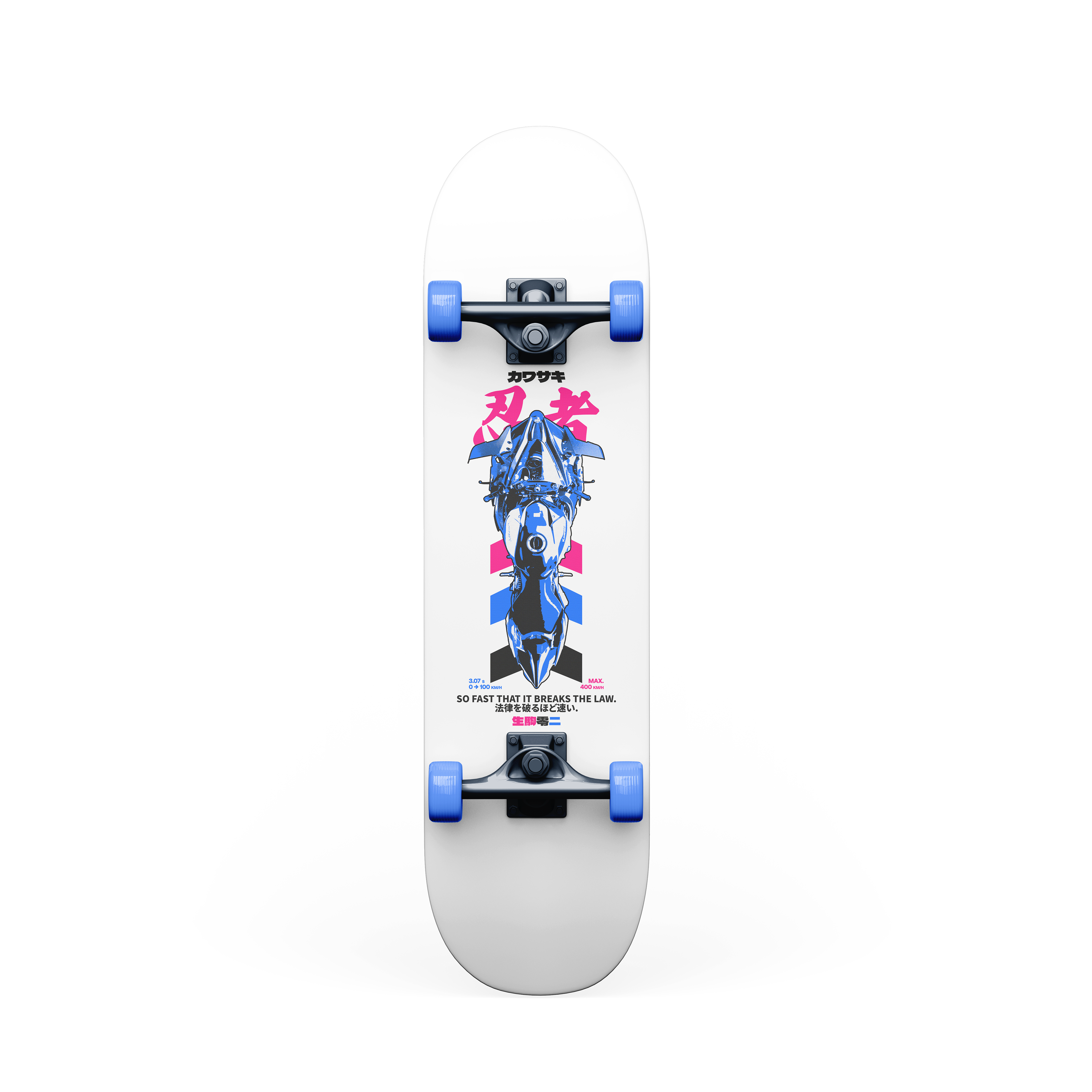 This merchandise was made for one of the fastest bikes in the world, the Kawasaki Ninja H2R. The silhouette is the original image of the bike that was used as the base for the design. The colors are taken from a contrasting cyberpunk style, and a few technical details are included with Japanese script, as Kawasaki is based in Japan.
