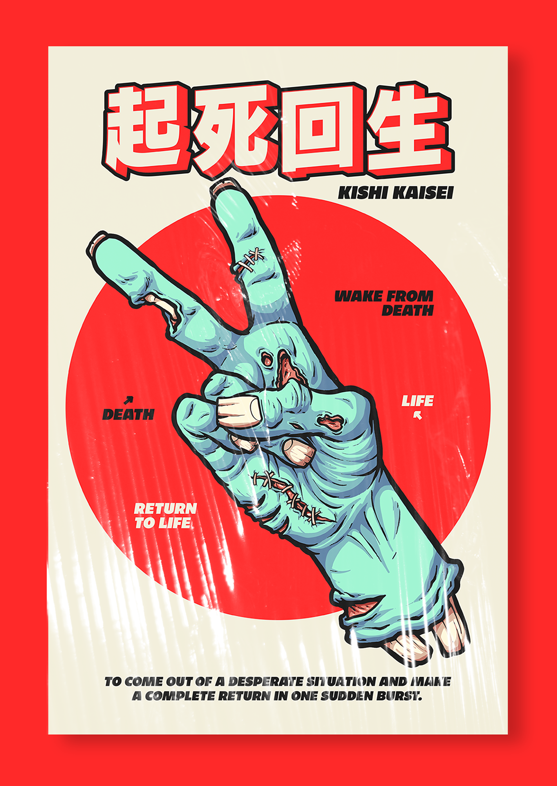 This retro-style poster design incorporates the Japanese saying "kishi kaisei," which means "wake up from death to return to life." It features a retro color palette and a graphic of a zombie hand.