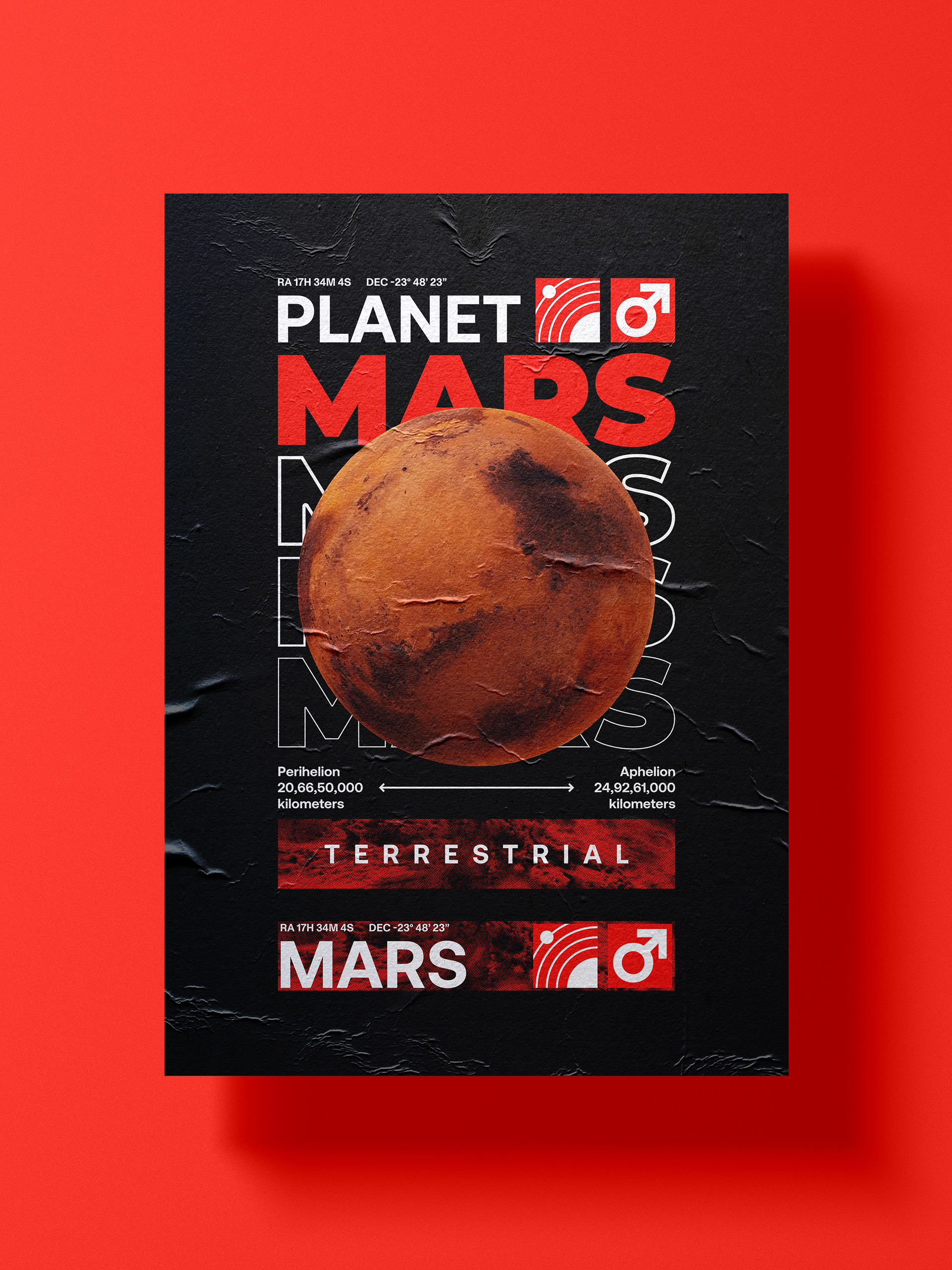 This poster or merchandise design features the planet Mars as the main subject. Symbols and technical information are added to give it a techno look, along with halftone effects.