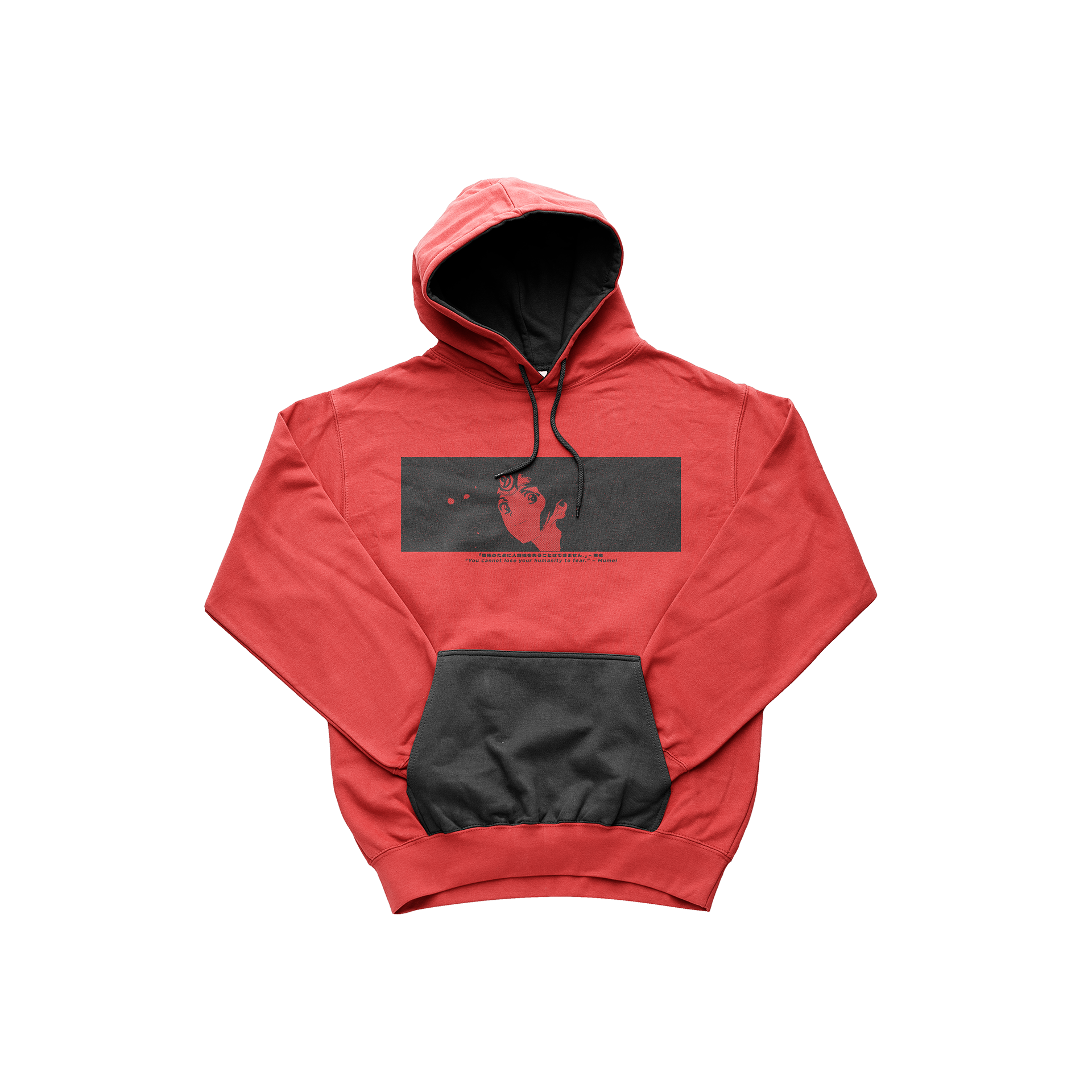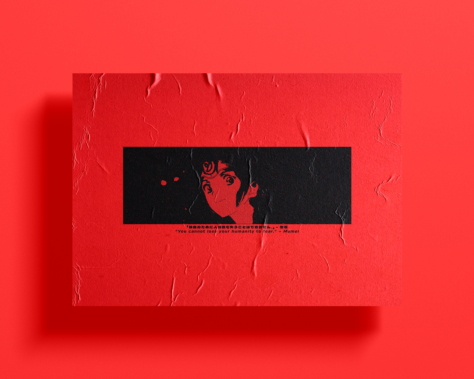 This design is in a minimalistic halftone style with low-key contrast. It was created for use on posters or apparel. The design includes a quote from the anime that the character is from.
