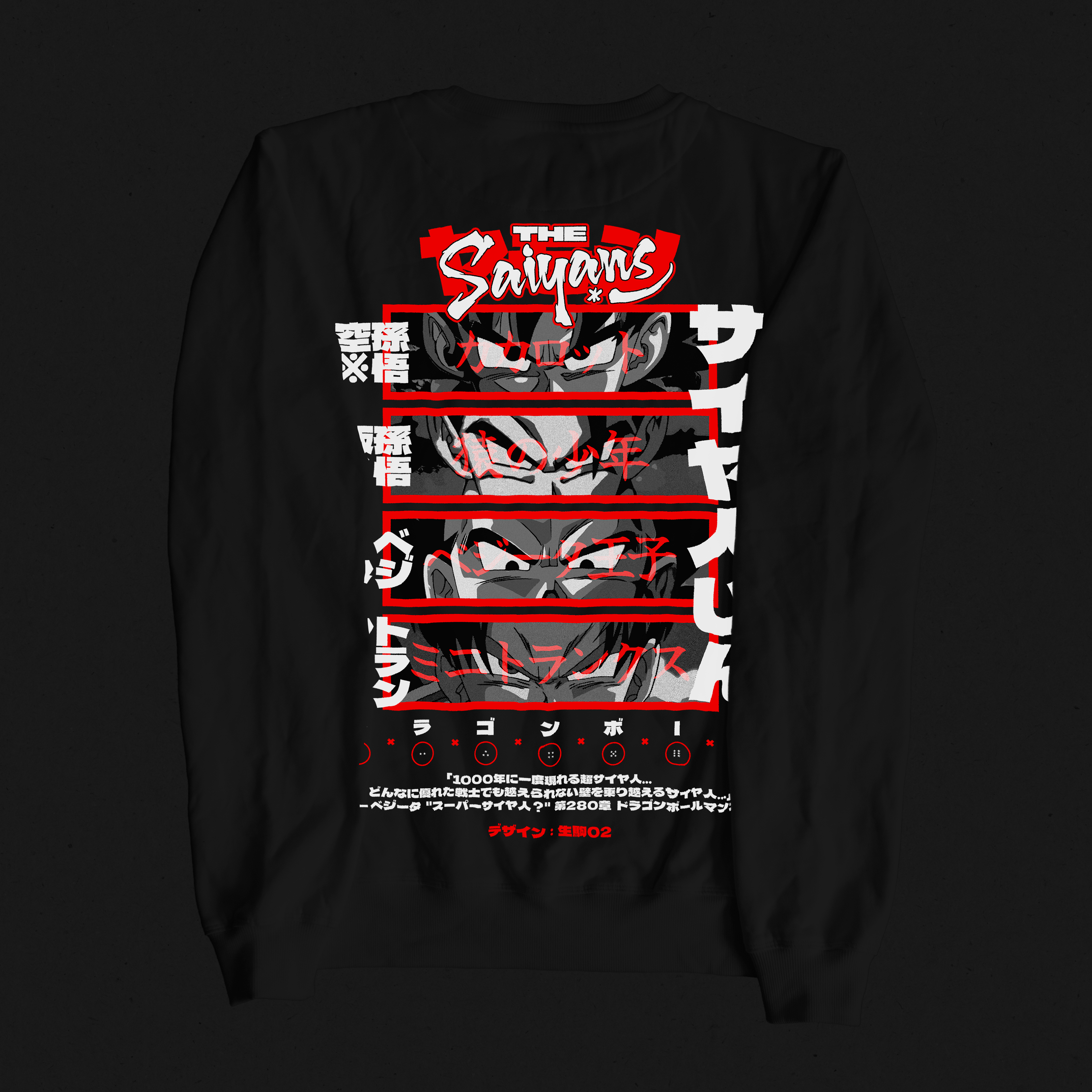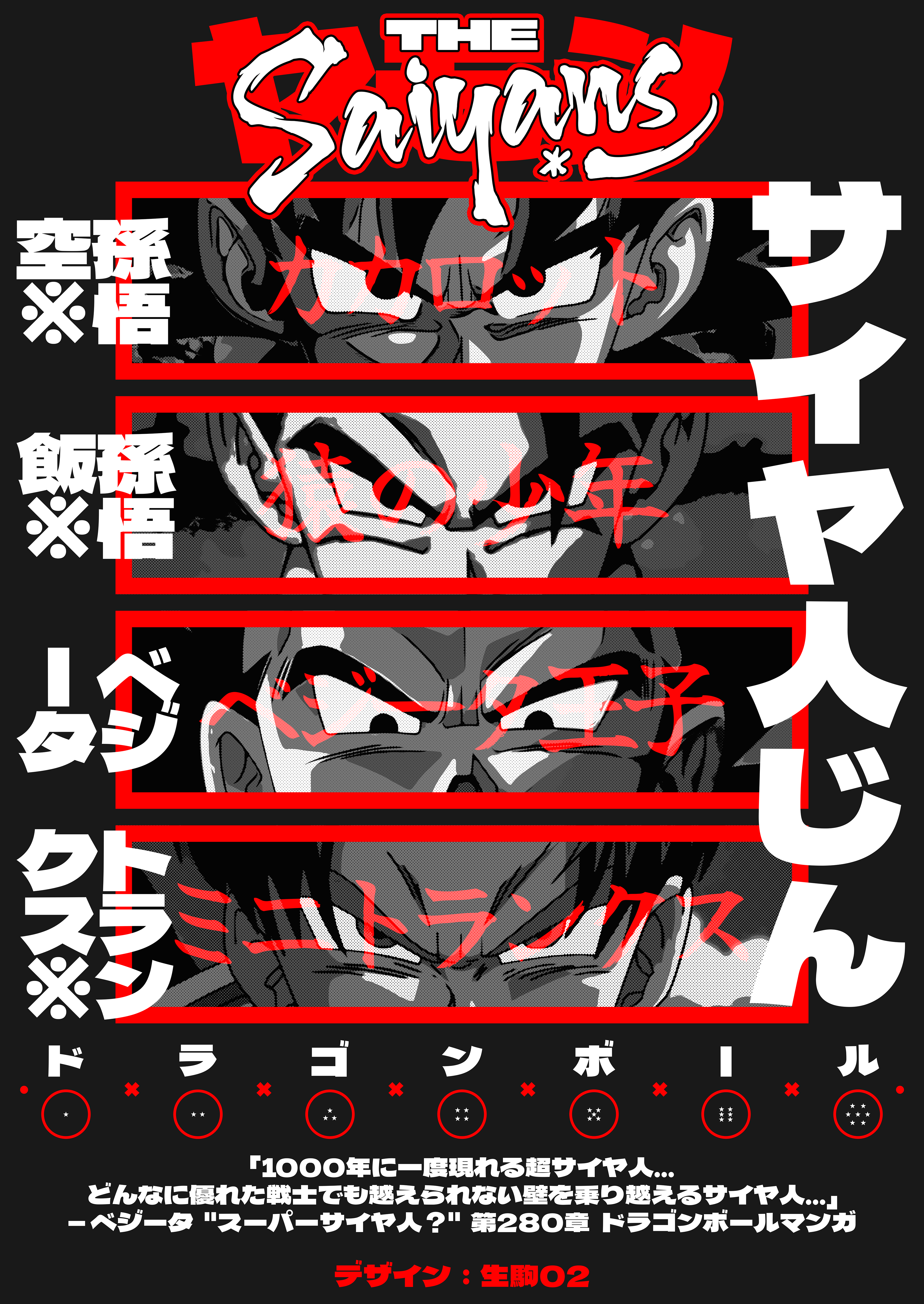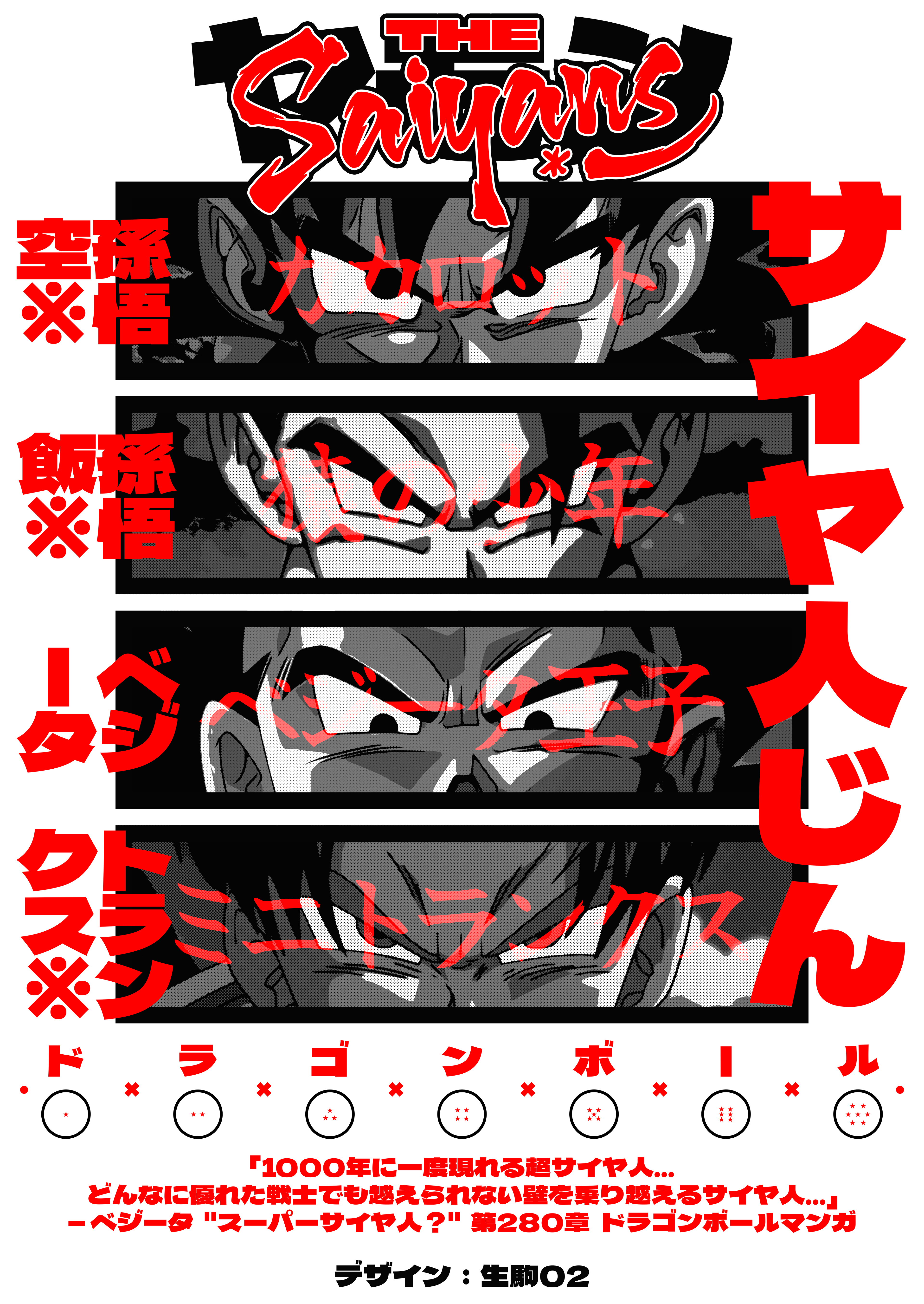 This poster and merchandise design was made for four of the saiyans: Goku, Gohan, Vegeta, and Trunks. The design is monochromatic with a red accent color. Two versions were made, one for a white background and one for a black background.